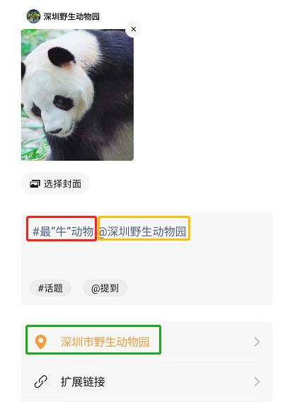 编辑视频素材,需满足三个条件再发表:带上话题#最"牛"动物、@深圳野生动物园、定位深圳野生动物园。发表后,在视频号集赞。