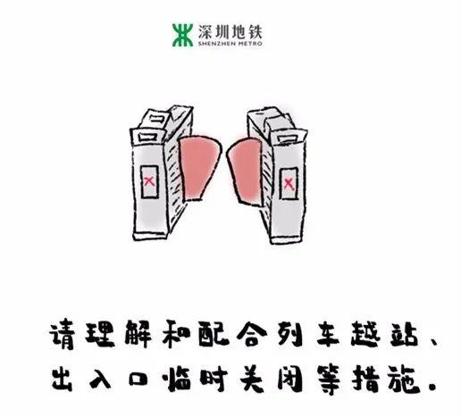 请理解和配合列车越站、出入口临时关闭等措施。疫情期间,深圳地铁将视现场客流情况和疫情防控需要加强大客流管控。如遇列车越站、出入口临时关闭等等措施,请您绕行至就近出入口或耐心等候下一班列车。