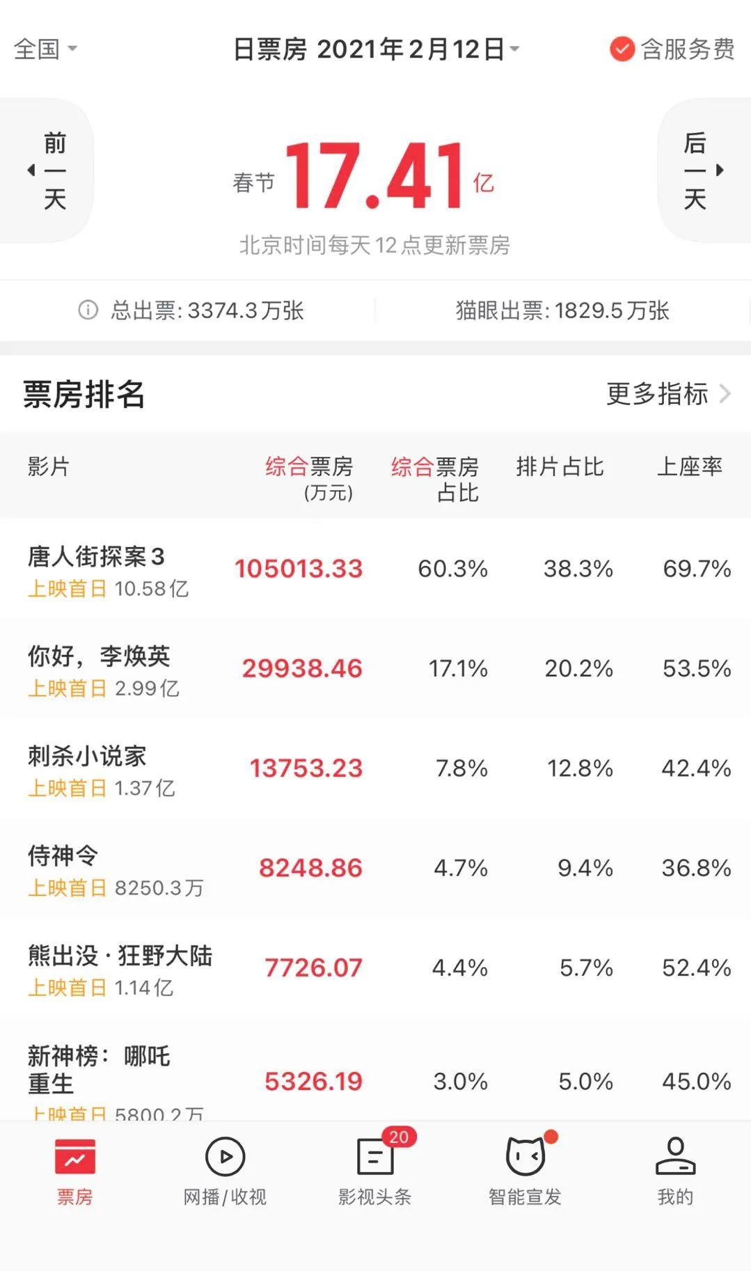 春节档首日票房17.41亿