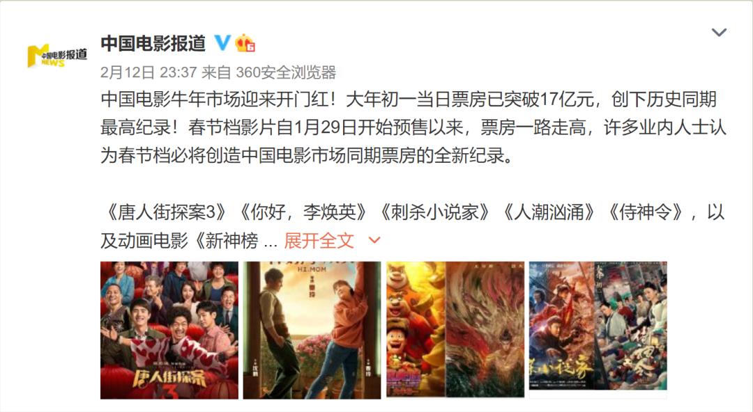 近年来,观影过年成不少民众的选择。今年大年初一全国电影票房超越了2019年大年初一的数据,更刷新了全球单一市场单日票房纪录。