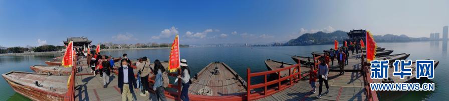 游客在潮州广济桥游玩(2月14日摄,手机全景照片)。