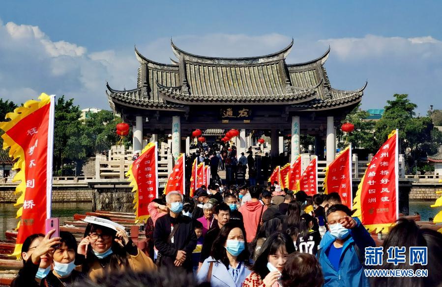2月14日,游客在潮州广济桥游玩。