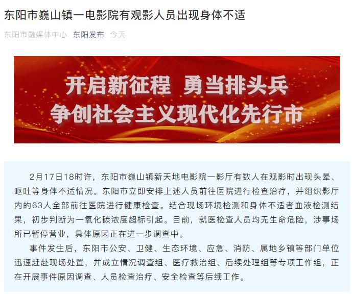 2月17日18时许,东阳市巍山镇新天地电影院一影厅有数人在观影时出现头晕、呕吐等身体不适情况。东阳市立即安排上述人员前往医院进行检查治疗,并组织影厅内的63人全部前往医院进行健康检查。结合现场环境检测和身体不适者血液检测结果,初步判断为一氧化碳浓度超标引起。目前,就医检查人员均无生命危险,涉事场所已暂停营业,具体原因正在进一步调查中。