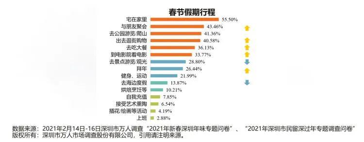 调查显示,逾五成市民响应国家倡议,居家过年;而外出市民的假期行程略显繁忙,除传统的走亲访友外,到公园景点打卡、逛街购物、吃大餐、看电影等行程占比都较高。
