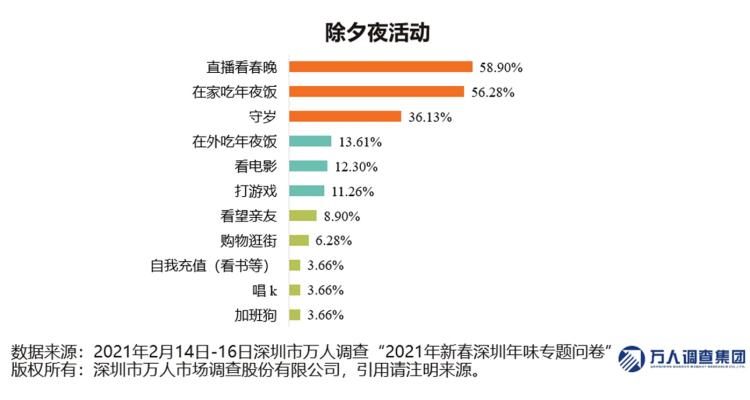 调查显示,吃年夜饭、看春晚、守岁依然是除夕活动首选。有56.28%的市民选择了在家吃年夜饭,在外吃年夜饭的只有13.61%。