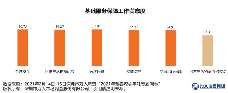 大量市民留深过年,城市公共服务保障必不可少。调查数据显示,春节期间,市民对深圳公共安全、物资供应、医疗保障、公共交通、疫情防控等放方面的各项基础服务保障工作都较为满意,得分都在85分上下。