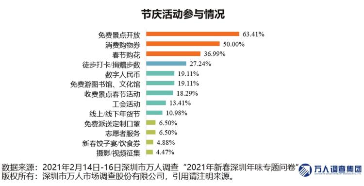 数据显示,留深市民积极参与相关活动,参与率为64.4%,其中21.2%的市民还参与了跨区域节庆活动。从参与活动类型来看,市民对免费景点开放、消费购物券、春节购花活动参与性较高。