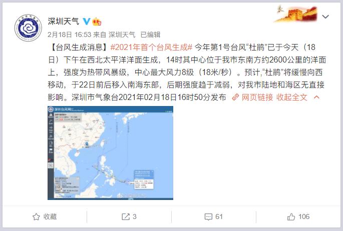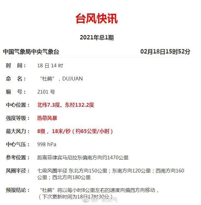 2月18日下午,今年第1号台风“杜鹃”(英文名称:Dujuan;名字来源:中国;名字意义:一种花)在西北太平洋洋面生成,强度为热带风暴级( 8级,18米/秒)。