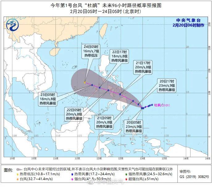 2月20日5时,今年第1号台风“杜鹃”(热带风暴级)的中心位于菲律宾马尼拉东南方约1340公里的菲律宾以东洋面上,北纬6.6度、东经130.1度, 中心附近最大风力有9级(23米/秒),中心最低气压990百帕,七级风圈半径120-200公里。