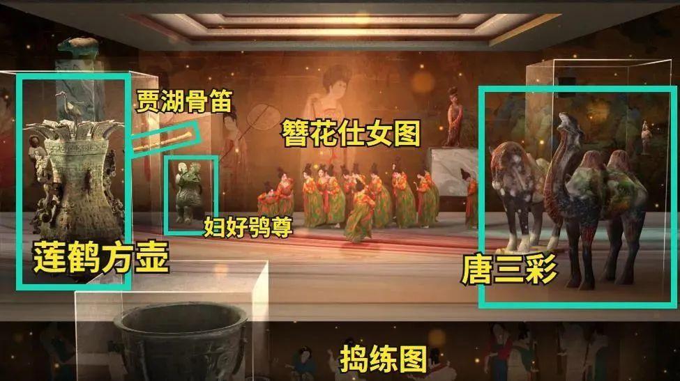 妇好鸮尊、莲鹤方壶 、贾湖骨笛、捣练图、簪花仕女图、备骑出行图、千里江山图等国宝