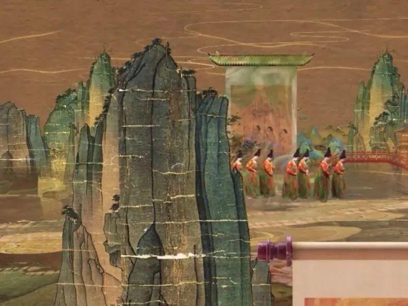 紧接着,随着舞蹈动作的展开,屏幕里出现了三副画卷,右边是《树下美人图》,左边是《备骑出行图》,中间是《侍马图》。