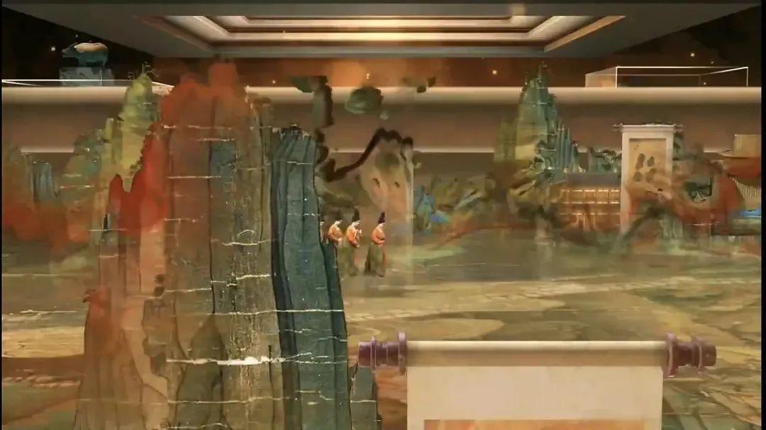 接着一个转场,正前方迎面向观众徐徐而来的是唐朝李思训、李昭道父子的《明皇幸蜀图》,现藏台北故宫博物院。