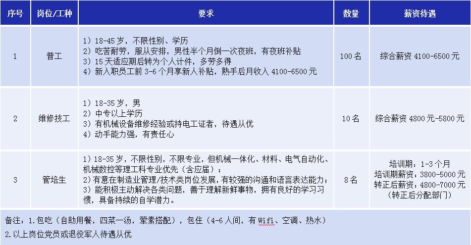 男女普工:18-48岁,初中以上学历,能吃苦耐劳,服从领导安排(底薪2200元,平时加班1.5倍,周六日加班2倍)。