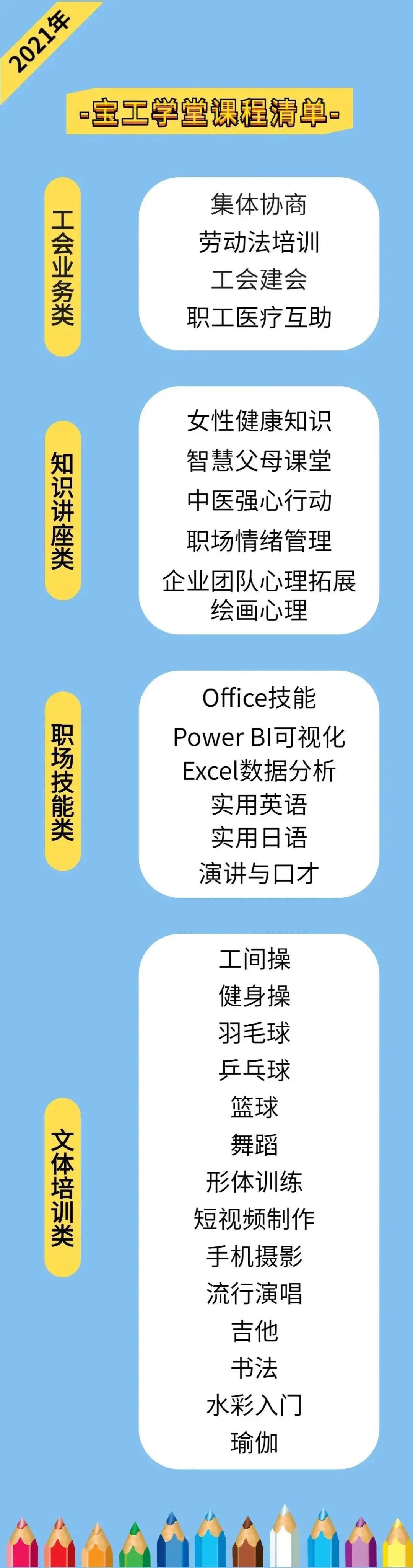 “宝工学堂”是宝安区总工会采取“进园入企”“送教上门”的形式,面向宝安区各级工会组织和广大职工开设的“全公益”“零收费”的培训课程。2021年,“宝工学堂”将在总结去年工作的基础上,不断优化升级课程库,为广大职工送上更优质课程!今天,宝工学堂带着最新“干货”来啦!快来瞧瞧~