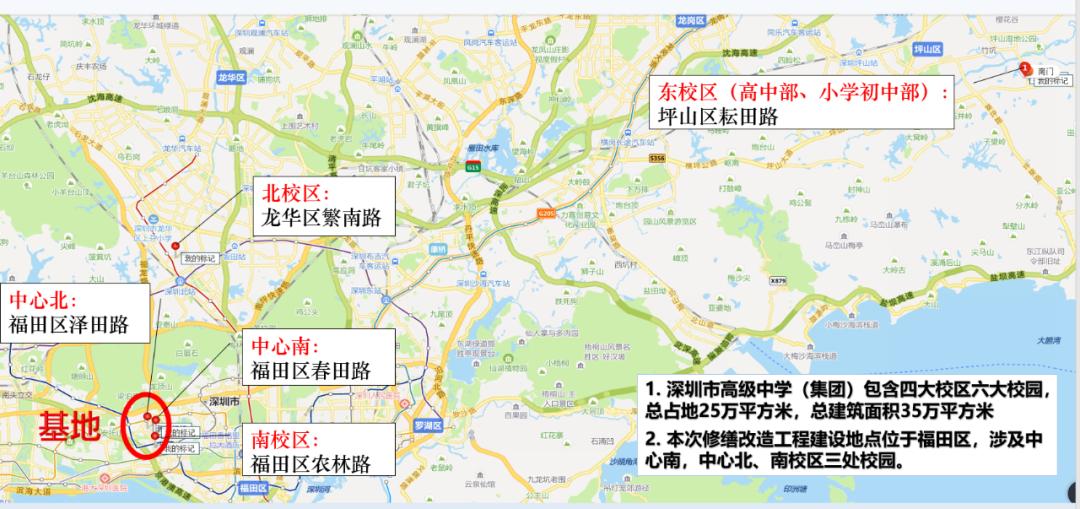 深圳市高级中学校园修缮改造工程项目位于福田区,涉及中心南,中心北、南校区三处校园。主要改造内容为: 建筑外墙砖修补、屋面琉璃瓦修补、建筑内过道修缮改造、食堂改造、文体楼改造、卫生间改造、校内供电系统及供水管网改造等。项目计划于今年6月份开工。