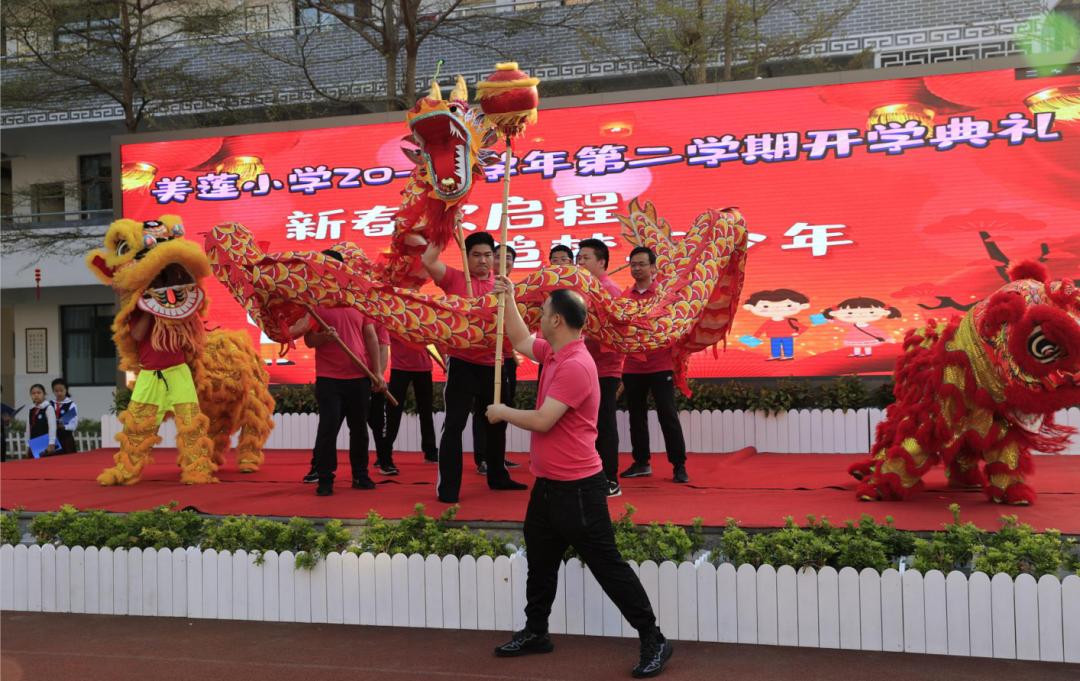 开学第一天,美莲校园装扮一新,校门口象征着勤奋聪明的“智慧拱门”最先迎接学生们返校,校园上空挂着的灯笼也随风摇摆,彰显着春节余韵。为了给老师们、孩子们、家长们送上春节祝福,同时感受优秀中华传统文化与传统风俗,美莲小学大队部的组织开展了“新春欢启程,追梦正少年”升旗仪式,并邀请了美莲小学附属幼儿园家长舞龙舞狮队来校表演。