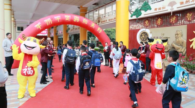 花城小学的孩子们又回到了校园,往日热闹的风雨操场铺上了鲜艳的红地毯,巨幅的拱门上“牛劲十足,犇向美好”八个大衣赫然醒目。在梁树生校长的带领下,校领导和中层行政干部早早来到校门口给每个孩子送上牛牛福袋和开学祝福。