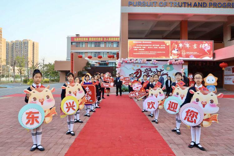 在龙高集团东兴外国语学校,“牛转乾坤”“牛气冲天”“嗨皮牛Year”……十几条憨态可掬的卡通牛、别样精彩的开学红包,一大早就在等候着东兴学子的到来。孩子们背着书包,捧着绿植,提着灯笼,神气十足地踏进喜气洋洋的校园。(记者 刘丽)