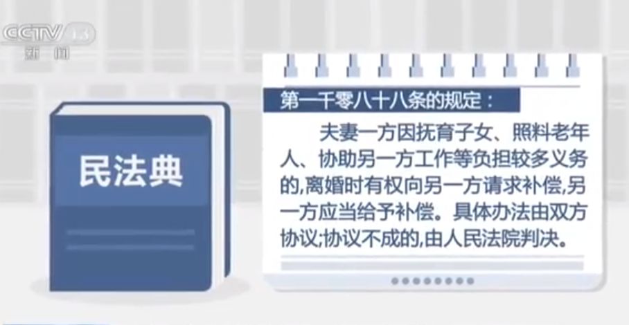 今年1月1日正式施行的《民法典》婚姻家庭编第1088条中,对此作出新规:夫妻一方因抚育子女、照料老年人、协助另一方工作等负担较多义务的,离婚时有权向另一方请求补偿,另一方应当给予补偿。具体办法由双方协议;协议不成的,由人民法院判决。这也是这起离婚家务补偿案判决的重要依据之一。