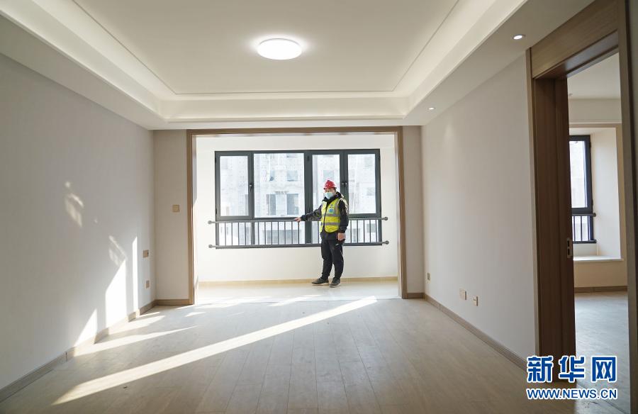 2月25日,在雄安新区G2组团安置房项目建设工地,工作人员展示精装修交付样板间。新华社记者才扬摄