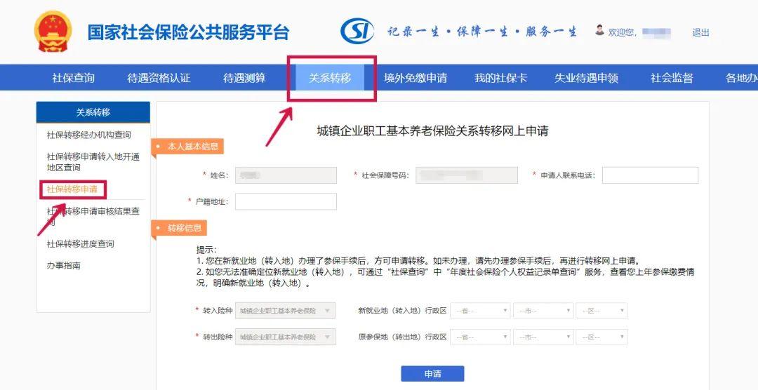 选择“关系转移”-“社保转移申请”