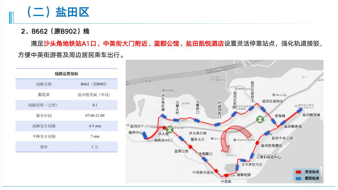 盐田精茂城、盐田税务局、壹海城、盐田区政府东、盐田区政府北、盐田区医院、叶屋西街口、元墩街口、元墩头村、沙头角社康、盐田区福利中心、合泰御景翠峰、招呼站(沙头角地铁站A1口)、沙头角行政服务大厅、招呼站(蓝郡公馆)、沙深路口、中英街关前站、招呼站(中英街)、海涛花园、太平洋住宅区、工青妇活动中心、招呼站(盐田凯悦酒店)、盐田中央公园、盐田税务局、盐田精茂城、沙头角公交总站