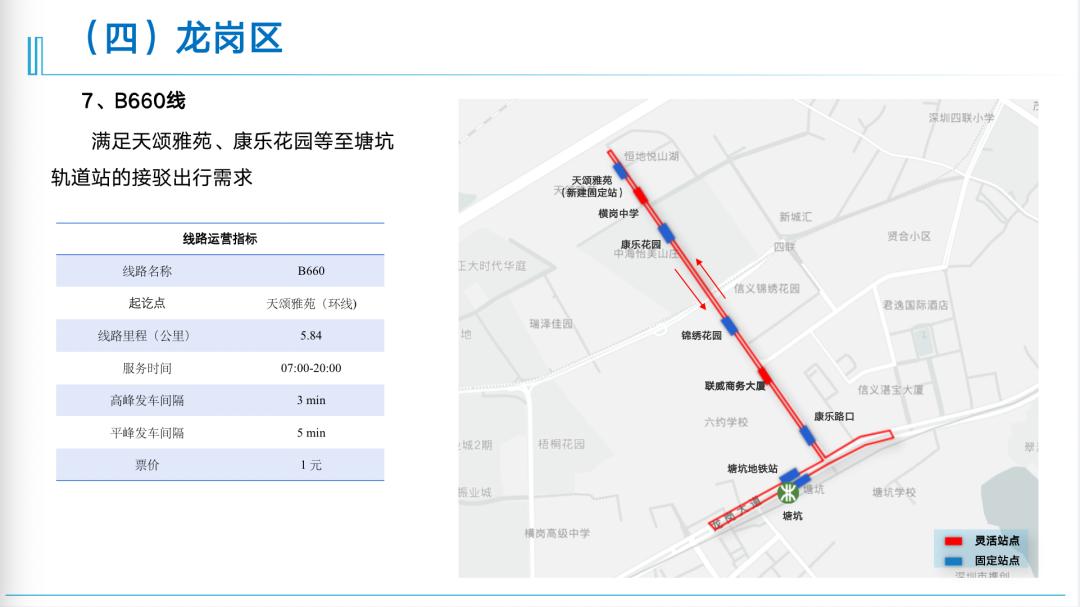 天颂雅苑、招呼站(横岗中学)、康乐花园、锦绣花园、招呼站(联威商务大厦)、康乐路口、塘坑地铁站(北侧)、塘坑地铁站(南侧)、康乐路口、招呼站(联威商务大厦)、锦绣花园、康乐花园、天颂雅苑