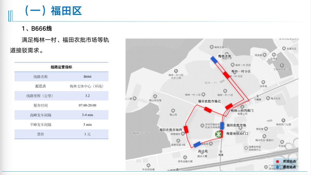 梅林文体中心(环线)、招呼站(梅林一村小区、梅林一村西南门)、福田农批市场、招呼站(梅景地铁站C口)、高达苑、招呼站(福田农批市场西、福田农批市场北、梅林一村小区)、梅林文体中心(环线)