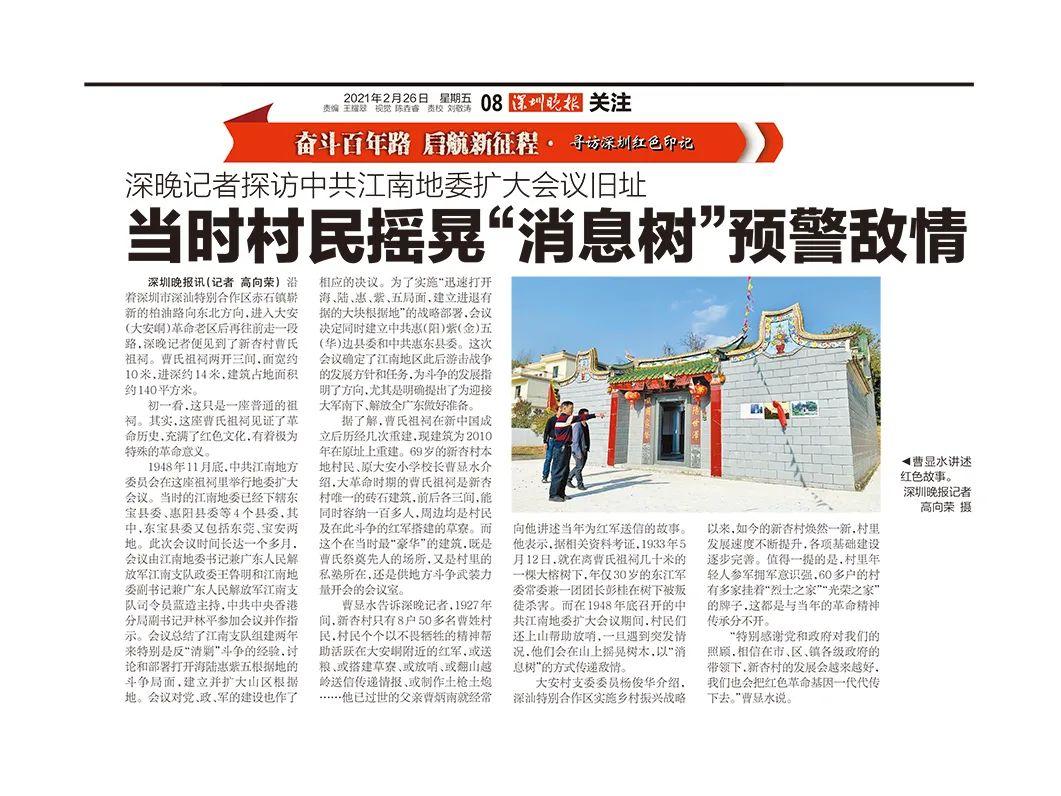 曹显水告诉记者,1927年间,新杏村只有8户50多名曹姓村民,村民个个以不畏牺牲的精神帮助活跃在大安峒附近的红军,或送粮、或搭建草寮、或放哨、或翻山越岭送信传递情报、或制作土枪土炮……他已过世的父亲曹炳南就经常向他讲述当年为红军送信的故事。据相关资料考证,1933年5月12日,就在离曹氏祖祠几十米的一棵大榕树下,年仅30岁的东江军委常委兼一团团长彭桂在树下被叛徒杀害。而在1948年底召开的中共江南地委扩大会议期间,村民们还上山帮助放哨,一旦遇到突发情况,他们会在山上摇晃树木,以“消息树”的方式传递敌情。