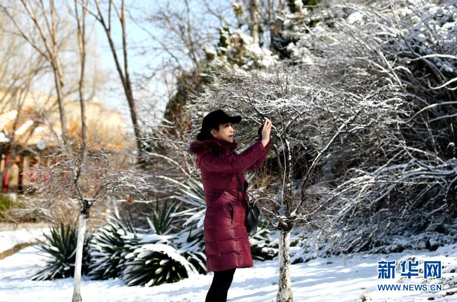 3月1日,市民在天津市南翠屏公园内拍摄雪景。新华社记者赵子硕摄
