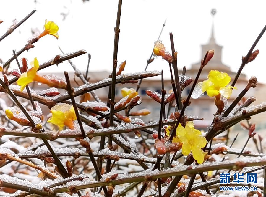 3月1日在北京中国人民革命军事博物馆附近拍摄的被冰雪覆盖的迎春花。新华社记者罗晓光摄
