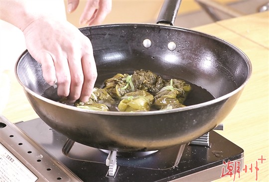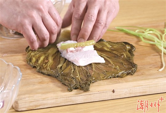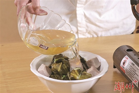 丁宏钊告诉我们,这道“荷包鳝”是潮州传统的手工菜,体现了潮州菜精致、圆融的特色。对食材“精雕细琢”的处理自不在话下,鳗鱼、五花肉与辅料的搭配,再包裹上酸菜叶,用高汤长时间炖煮,使得口感鲜美、肥而不腻。