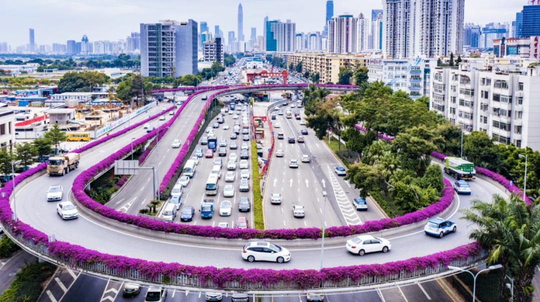 许多立交桥的两侧也开满了簕杜鹃,如同被“描上”了红色的花边。其中,滨河车公庙立交上的簕杜鹃花带达2.6公里之多,北环香蜜湖立交沿路的簕杜鹃花带长2.5公里。一路看过去红红火火,被市民网友形容为“花开爆了”。