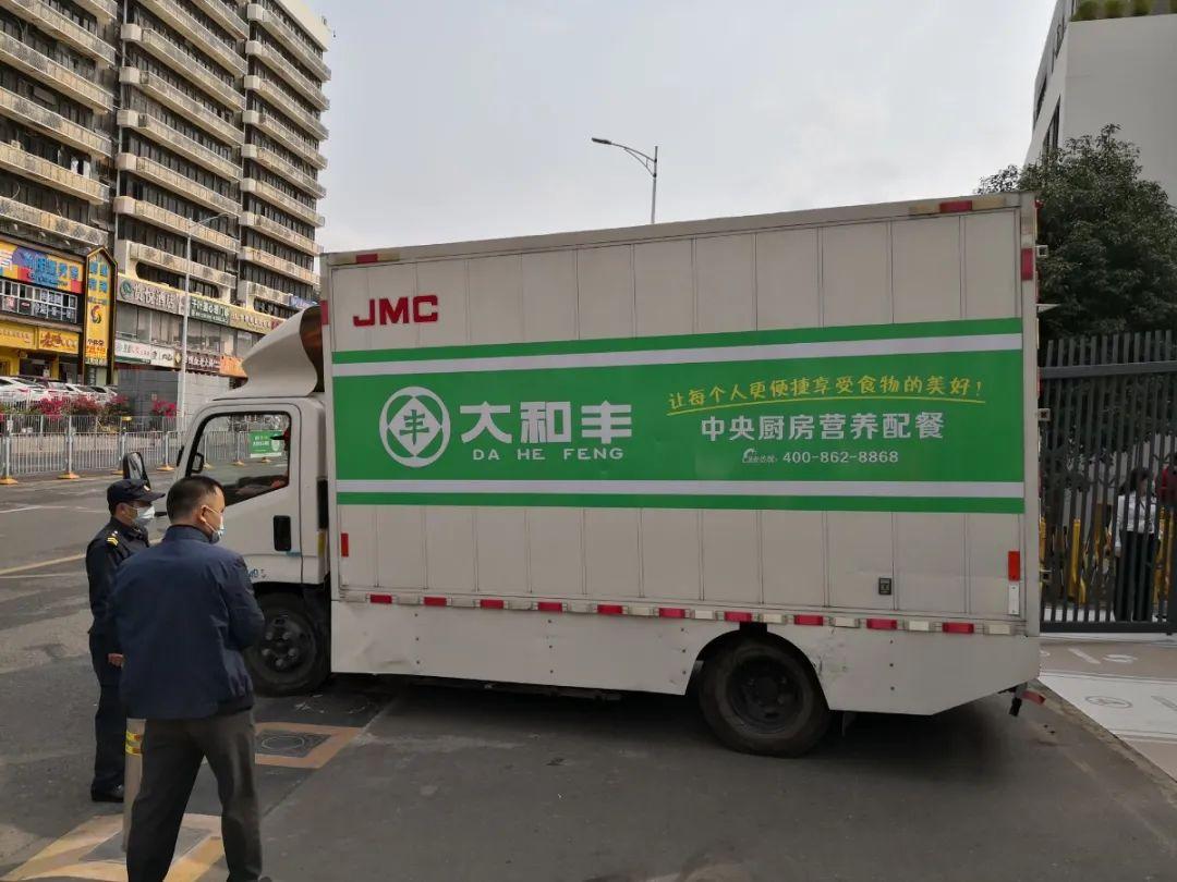 执法人员检查配餐车
