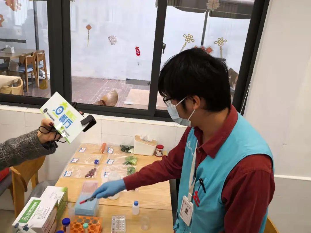 在活动现场,“蓝马甲”快检人员对后厨的原材料进行快检