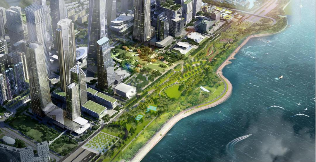 同时,滨海大道(总部基地段)路面实现下沉后,将释放超级总部基地与深圳湾公园间约10万㎡地面空间