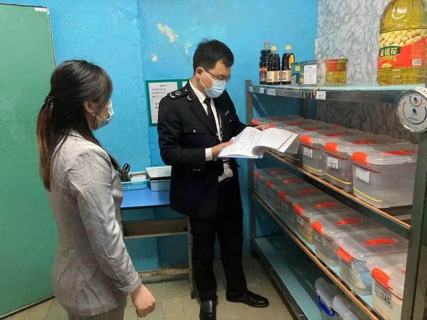 市市场监管局龙岗局龙岗所对五联崇和学校和五联幼儿园校园食堂就餐环境、后厨操作间及食材仓库等开展详细检查,重点检查了地面的卫生状况,下水道的清洁情况,菜刀砧板的生熟食区分、消杀记录等,查看食堂原料是否有过期变质原料,原料索证索票及食材台账是否齐全,要求学校严格按照疫情防控措施保持就餐间隔,并做好配餐、试吃、日常检查等记录。