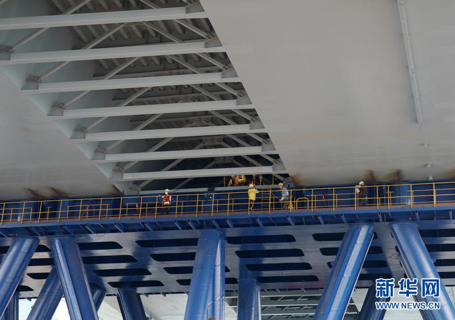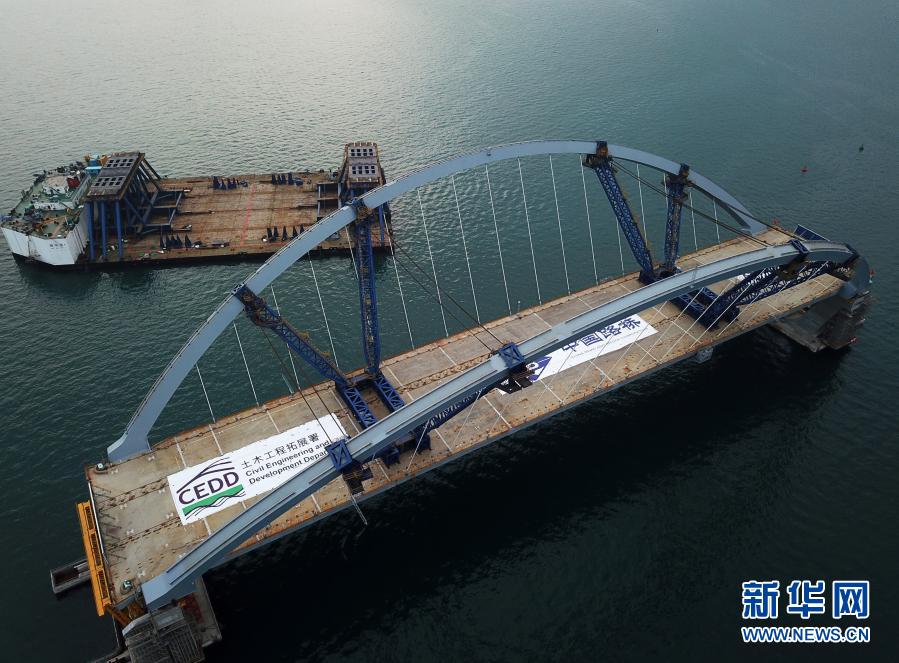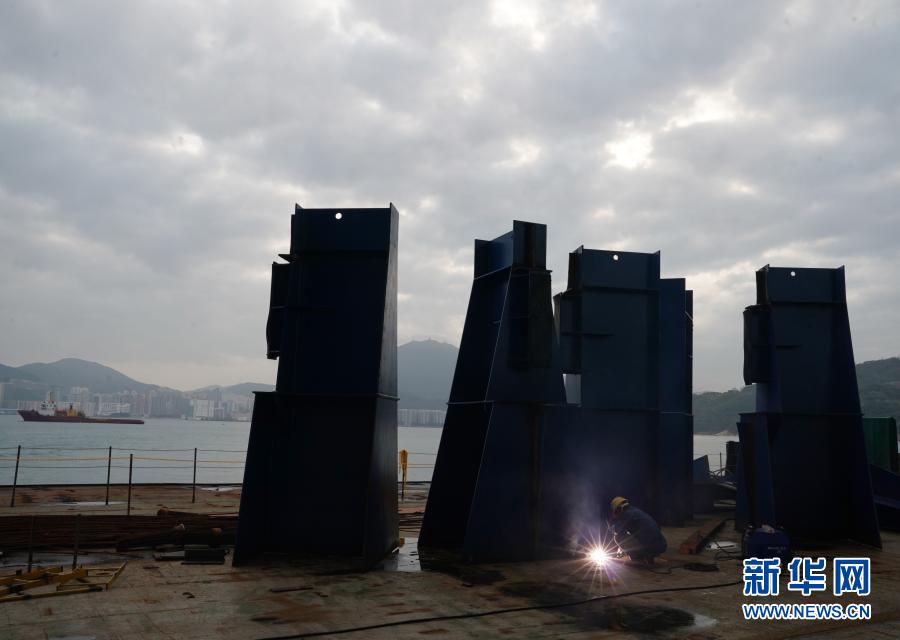 工人为即将安装的香港将军澳大桥主桥进行最后准备工作(2月25日摄)。新华社记者李钢摄