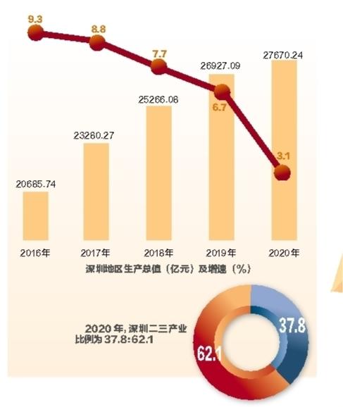 经济保持较快增长,深圳经济总量已跃居内地城市第三。在“十三五”期间,深圳地区生产总值从2015年的1.84万亿元提高到2020年的2.77万亿元,年均增长7.1%,这个速度高于全国和省同期增速1个百分点以上。