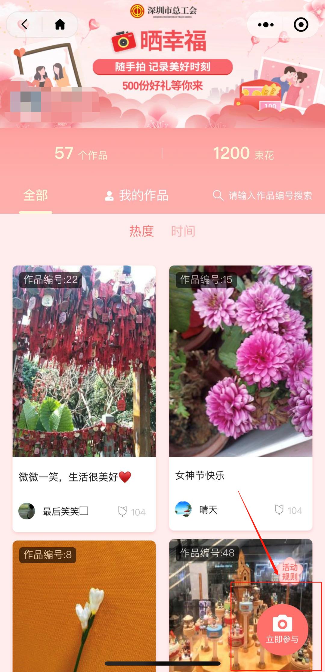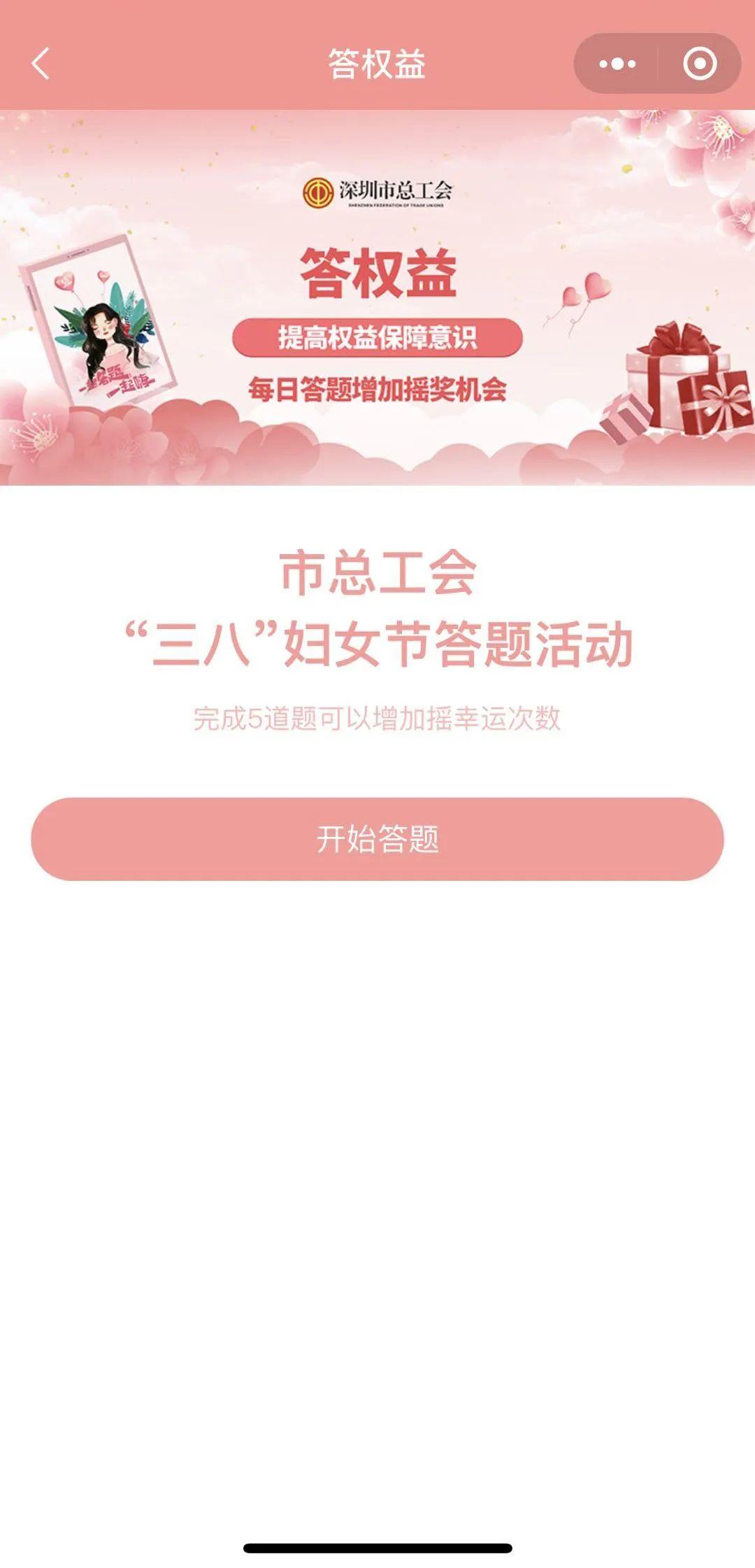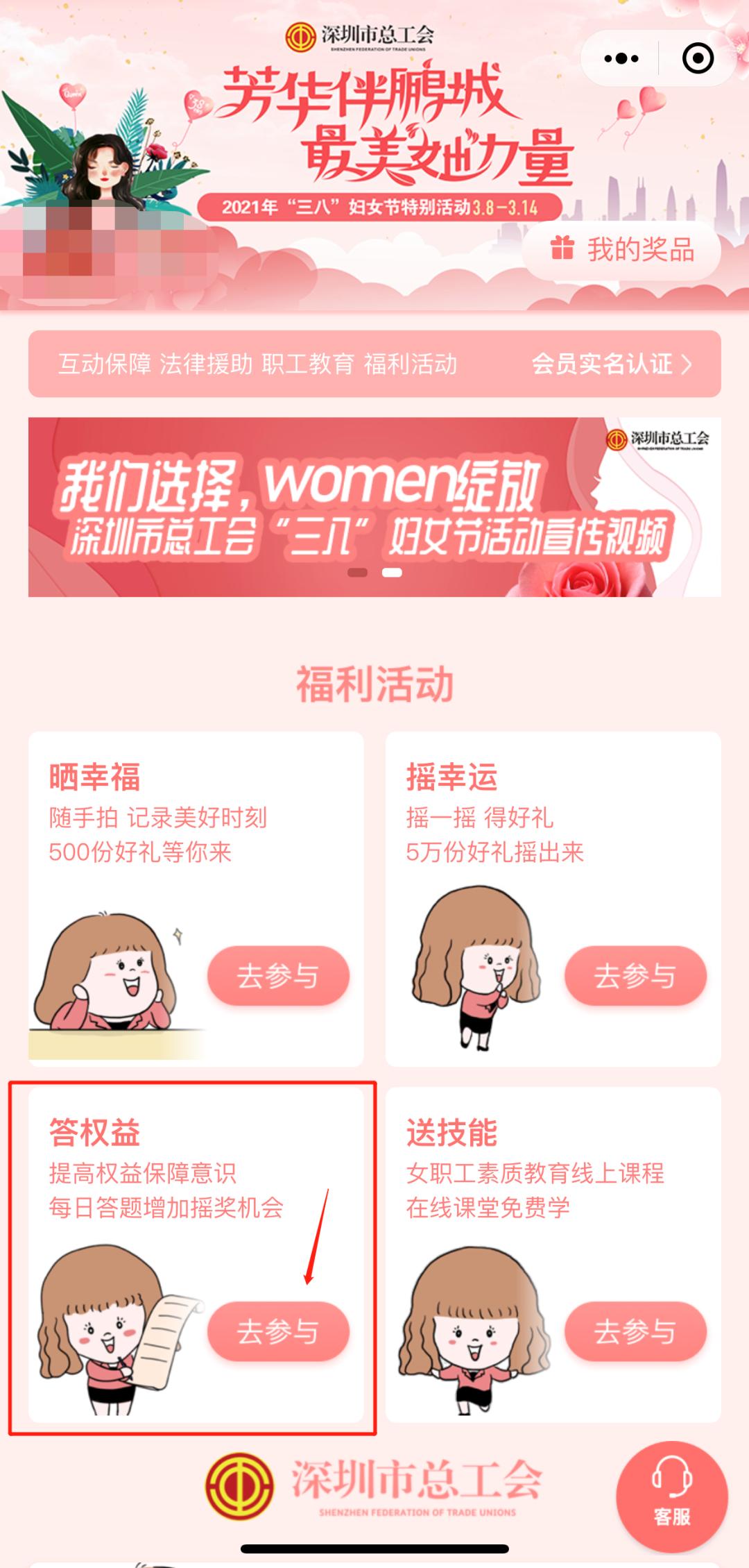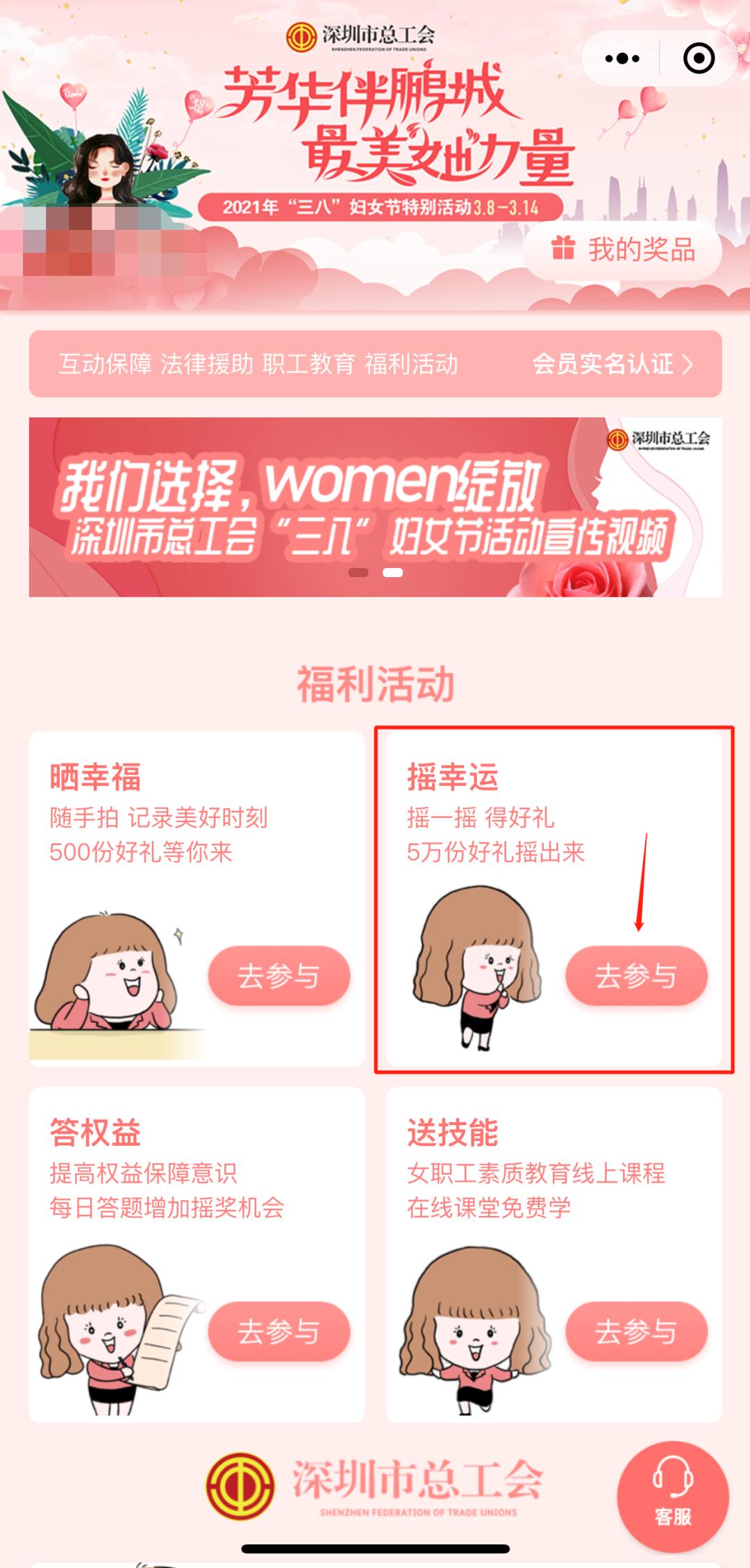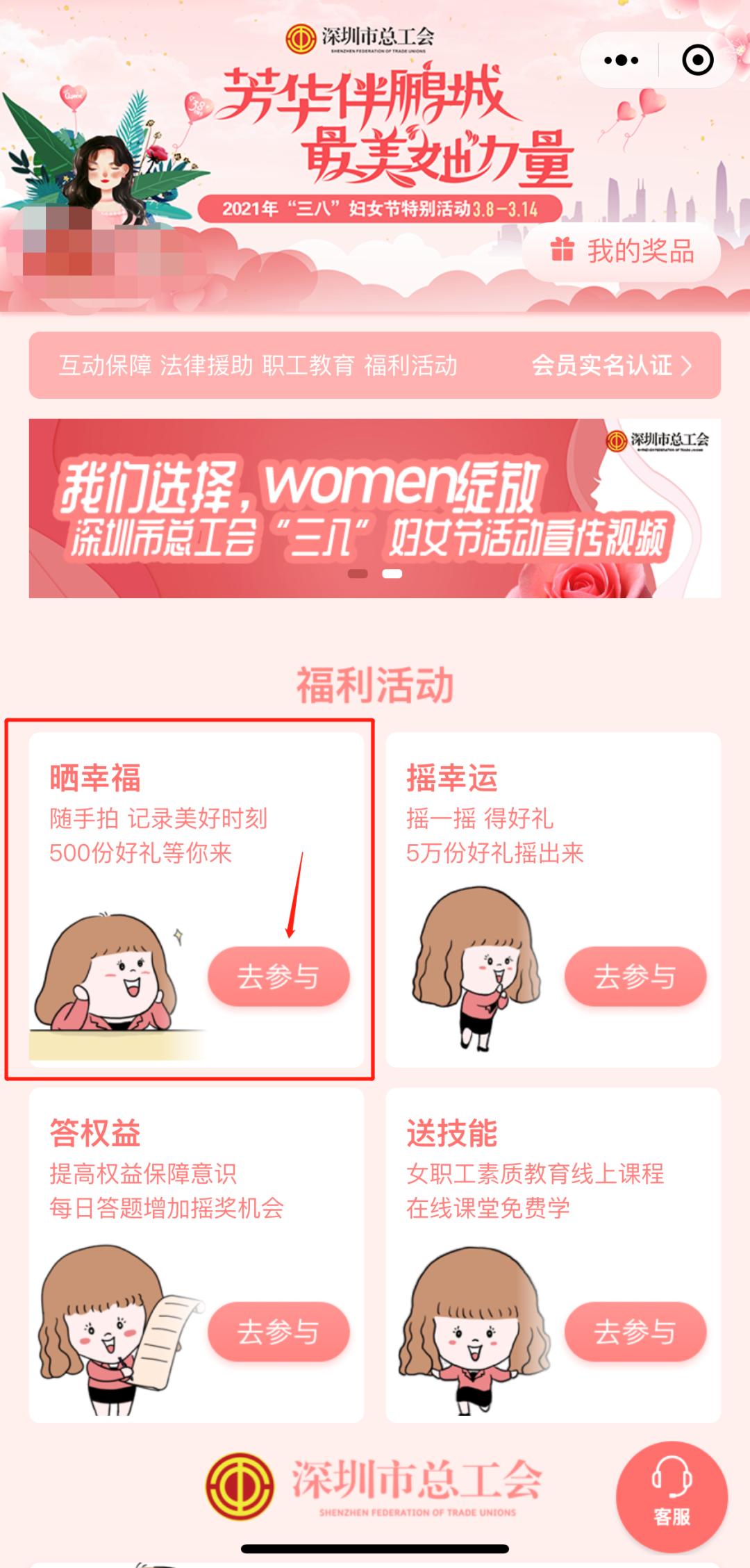 “芳华伴鹏城 最美‘她’力量”有奖活动,是深圳市总工会在“三八”妇女节期间,面向全市职工小伙伴举办的系列线上活动,以“芳华伴鹏城 最美‘她’力量”为主题,包含“晒幸福”“摇幸运”“答权益”“送技能”四大内容。