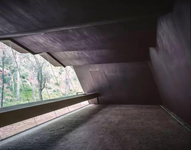供私人酿酒品酒的葡萄酒窖坐落于葡萄园与树林之间,采用将建筑部分嵌入地下的设计手法,从而形成一个景观和建筑的融合体。倾斜的回收钢板区隔出步道长廊,钢板之间留有狭缝,可将自然光线引入。