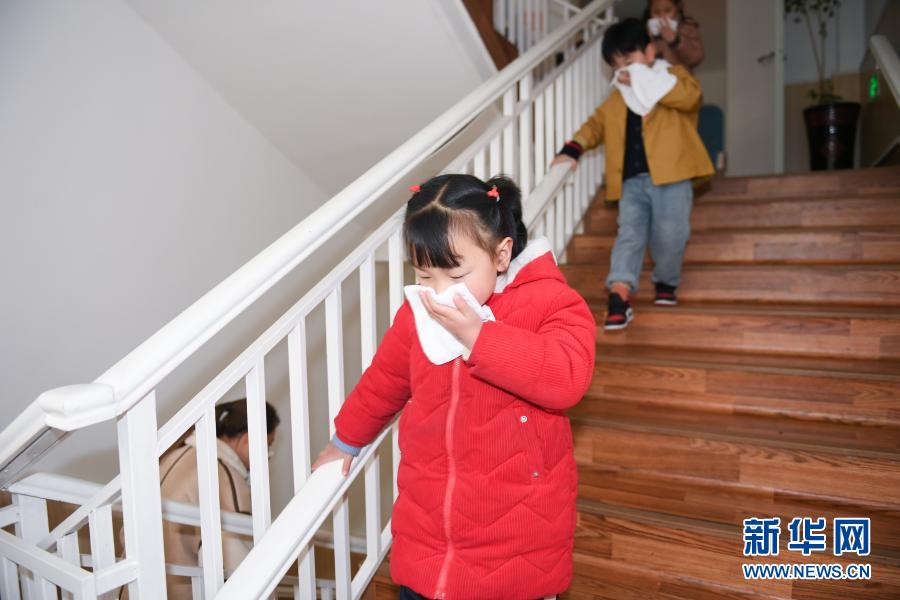 3月8日,小朋友进行消防逃生演练。