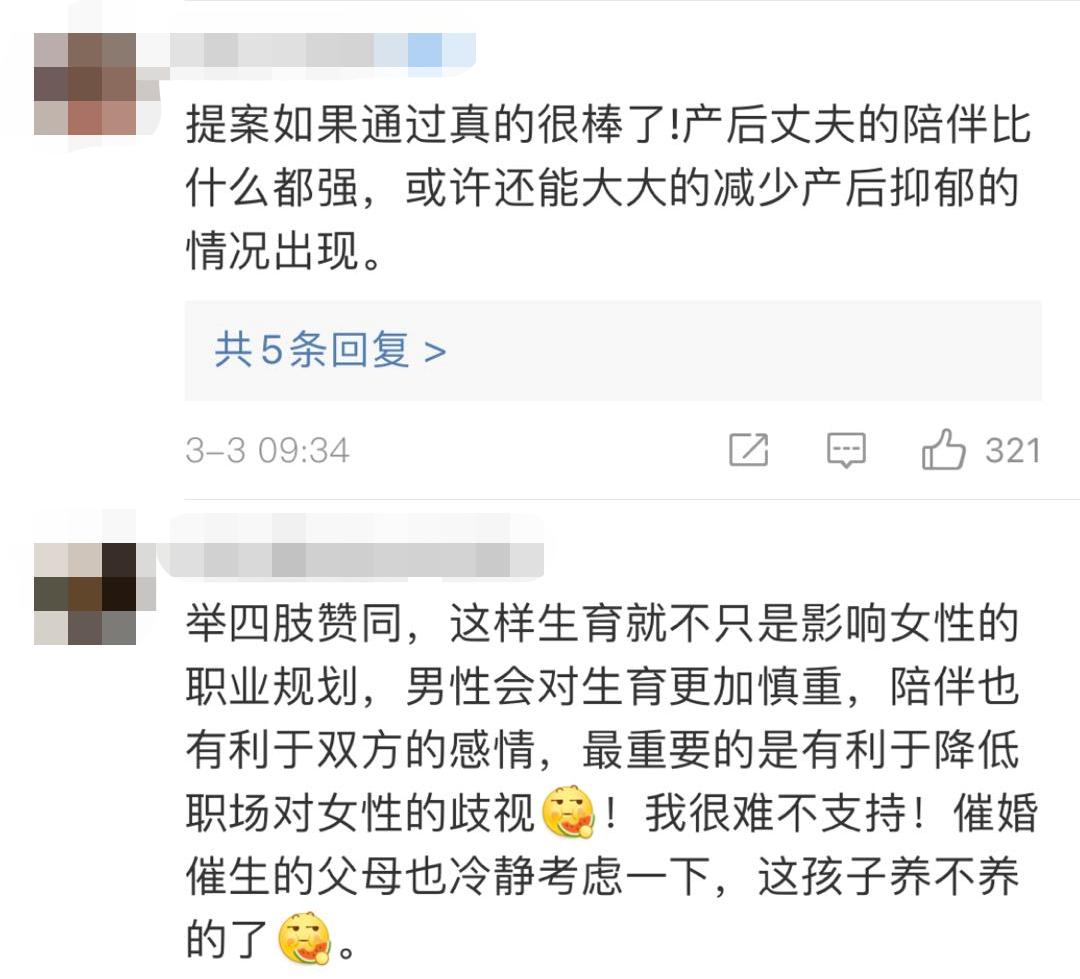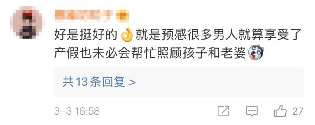 ★ 另一方面,持反对意见的网友认为,虽然生育问题与男性有关,但产假休那么多天有点说不过去,毕竟不是男人怀孕,休息时间太长反而会加重家庭矛盾,也不利于企业运营。