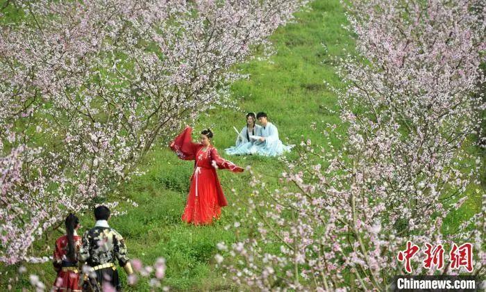 资料图:眉山市东坡区桃花林中展示汉服的爱好者。 刘忠俊 摄