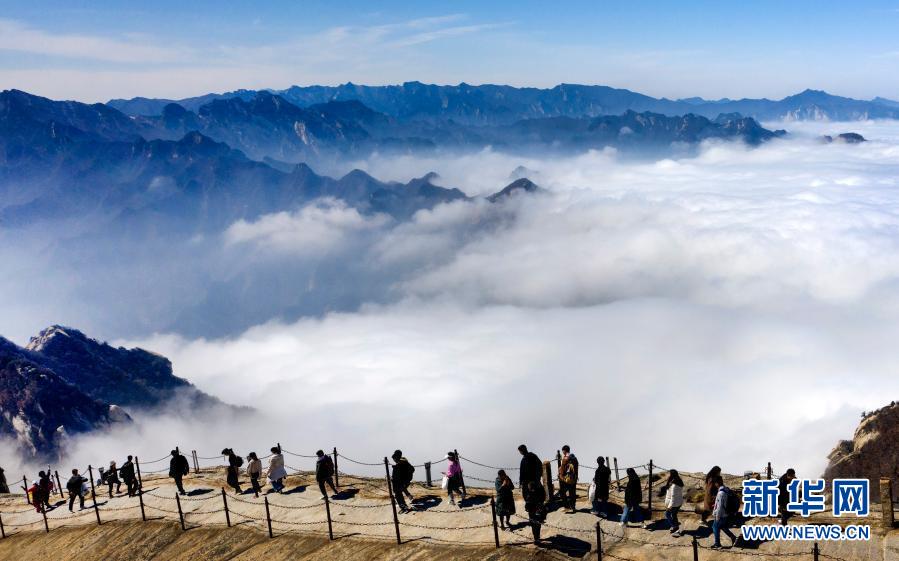 3月9日,游人在华山西峰游览(无人机照片)。