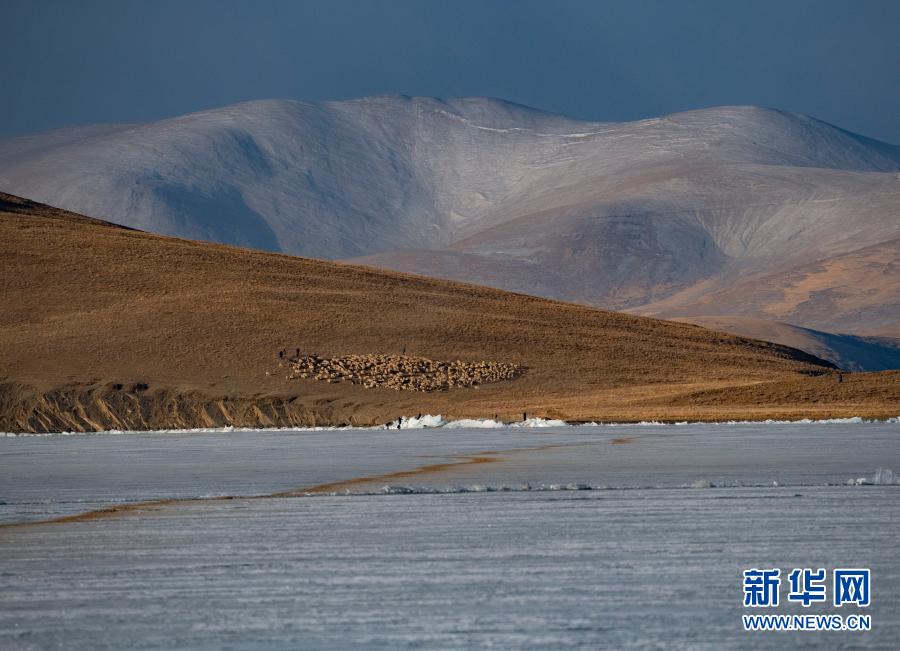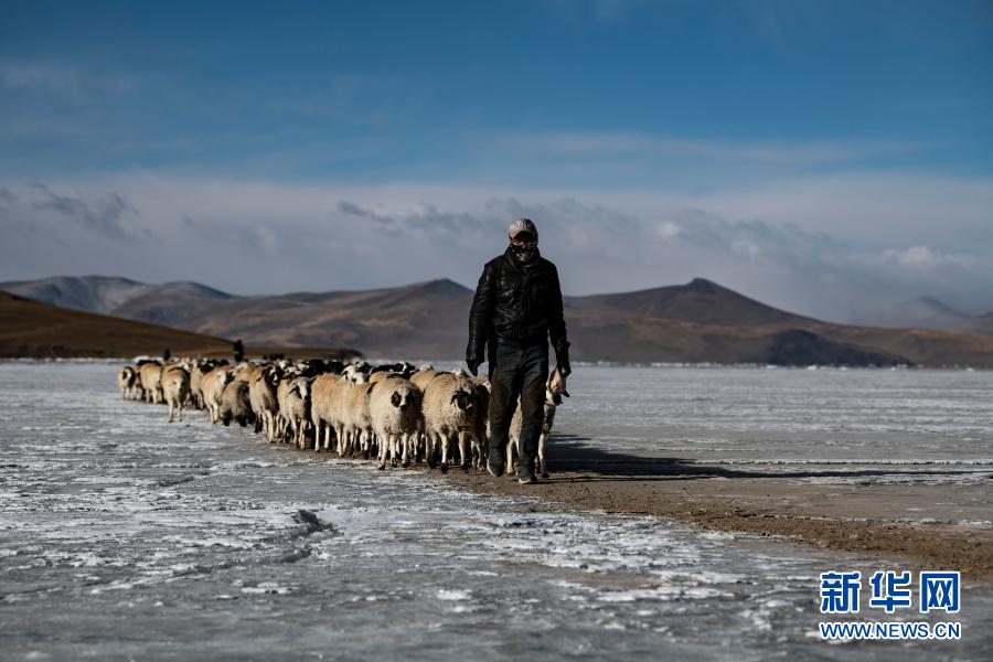羊群顺着安全小路通过普莫雍错冰湖(3月6日摄)。新华社记者孙瑞博摄