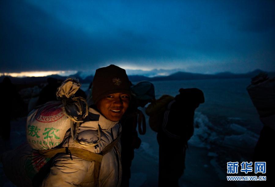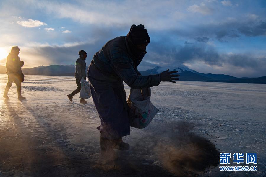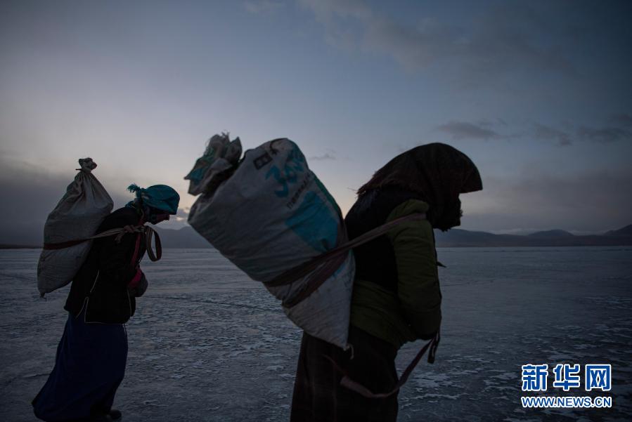 西藏山南市浪卡子县堆瓦村的村民清晨背着牛粪炉灰来到普莫雍错湖边,准备修通安全小路(3月6日摄)。新华社记者孙非摄