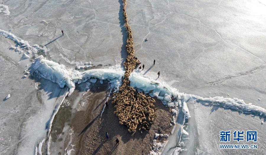 羊群顺着安全小路通过普莫雍错冰湖(3月6日摄,无人机照片)。新华社记者晋美多吉摄