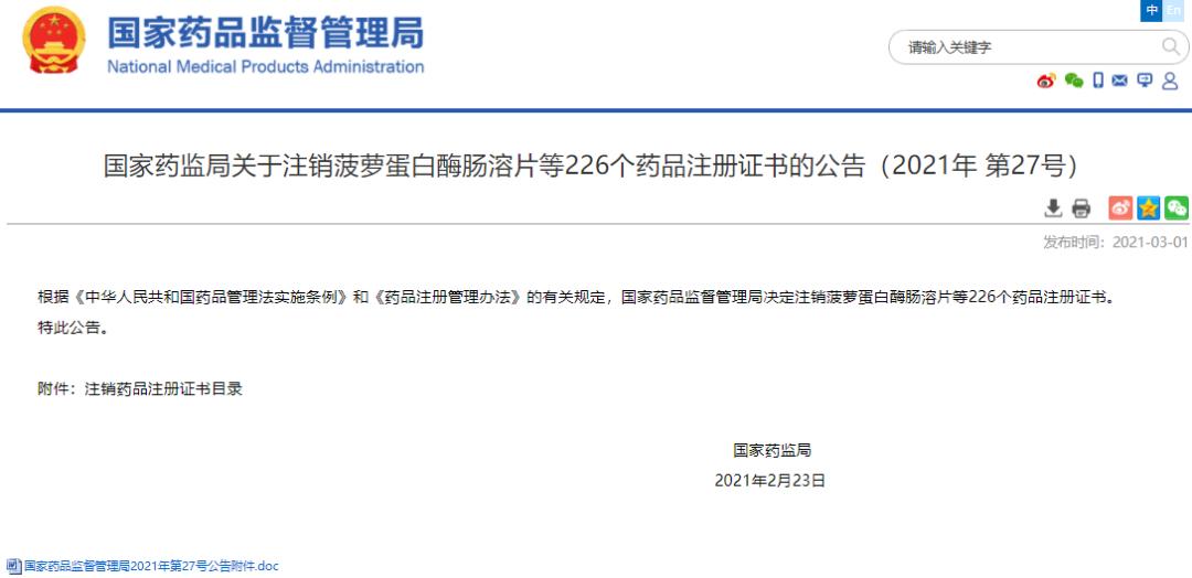 近日,国家药监局官网发布了《关于注销菠萝蛋白酶肠溶片等226个药品注册证书的公告(2021年 第27号)》(简称《公告》),一批药品依照企业申请退市停售,其中不乏我们熟知的西咪替丁胶囊、乙酰螺旋霉素片等常见药。