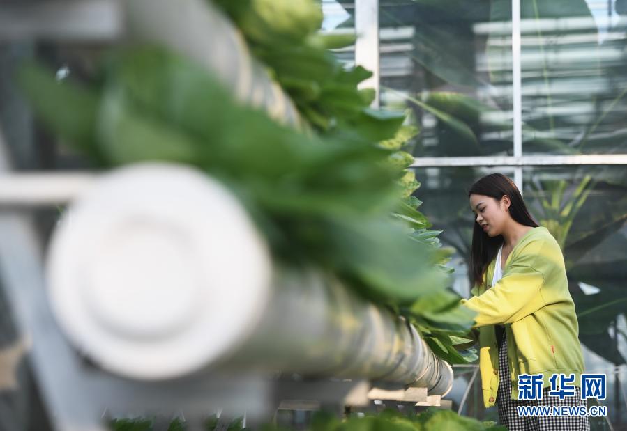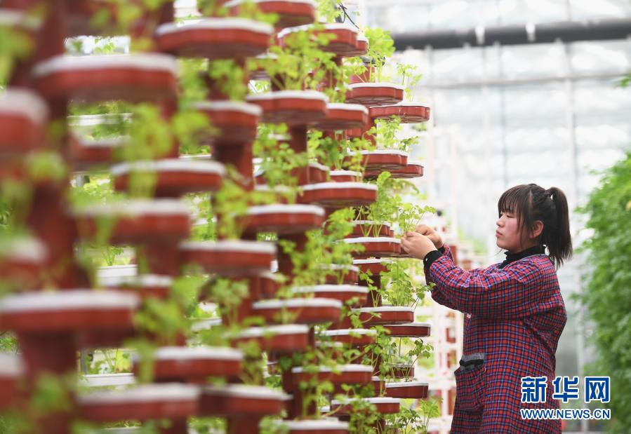 3月9日,在河北省曲周县一家创意农业园区,工人在管理立体无土栽培蔬菜。